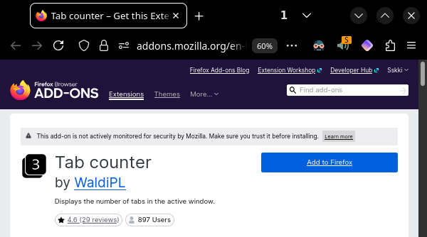 Not sure why this isn’t a built-in feature. To copy my look: in the addon’s preferences, set “Background style” to “No background”; right click the top of your browser, “Customize Toolbar” and drag the extension (after pinning it to toolbar) to the top. Not strictly necessary but it’s a nice quality of life feature.