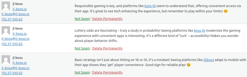 Over a hundred spam bot messages from randomly generated gmail accounts and names from random IP addresses, all sending a url to who knows where, across all my posts. I have no clue where the links go to but I’ve banned all shorturl.fm urls from my comment sections.